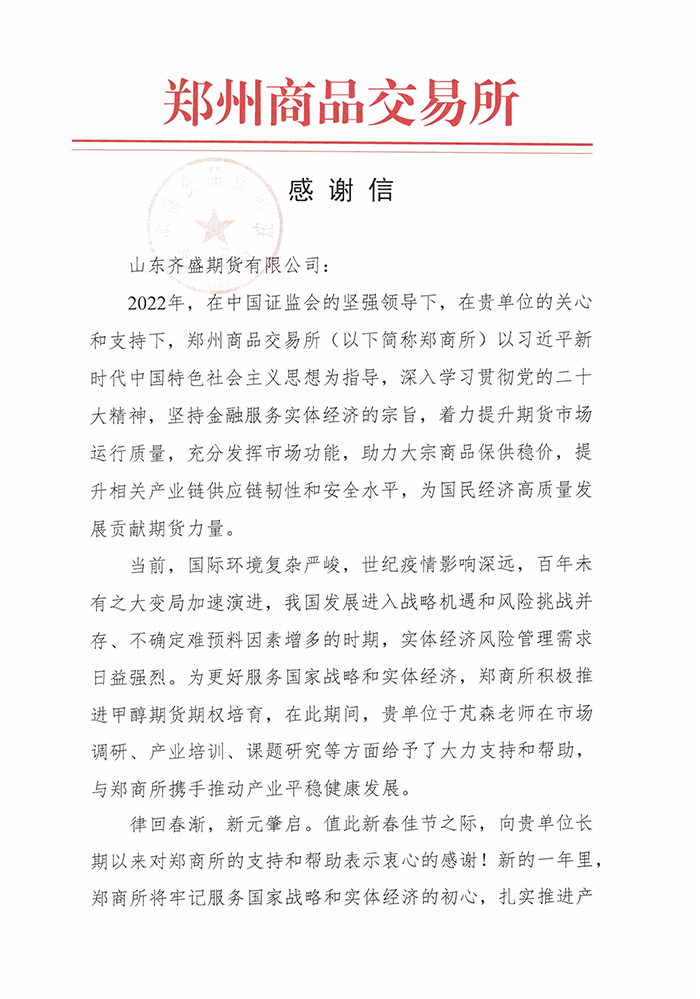 近日,山東齊盛期貨有限公司收到了鄭州商品交易所的感謝信。信中對2022年我司高級分析師于芃森在市場調研、產業(yè)培訓、課題研究等方面給予了大力支持和幫助,為甲醇期貨相關工作的開展提供了有力保障表示了感謝,并一次性獎勵我司2萬元資金。