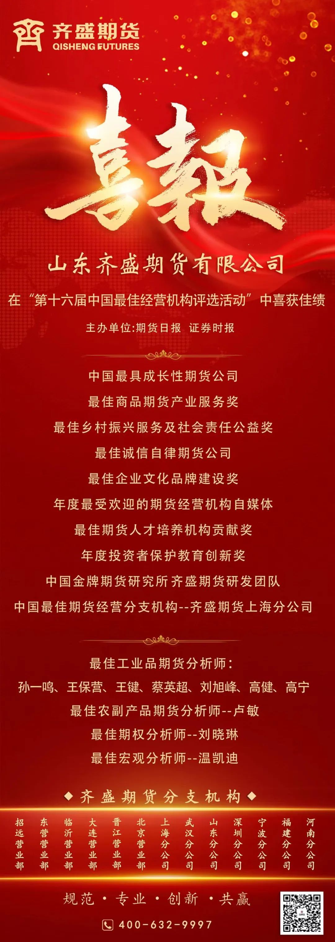 “中國最佳期貨經(jīng)營機(jī)構(gòu)暨最佳期貨分析師評選”自2007年以來已成功舉辦十六屆,是國內(nèi)最早設(shè)立、行業(yè)中最權(quán)威和最具影響力的評選活動。該活動是行業(yè)交流的重要平臺,為期貨公司提供了良性競爭的舞臺,同時也為行業(yè)發(fā)掘了大量優(yōu)秀研究人才,促進(jìn)了期貨行業(yè)研究力量發(fā)展壯大,齊盛期貨榮獲多個獎項這是業(yè)界對齊盛期貨近幾年快速發(fā)展的高度認(rèn)可和褒獎。