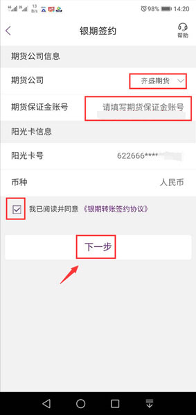 選擇期貨公司,輸入資金賬號,勾選“我已閱讀并同意“,再點擊下一步。