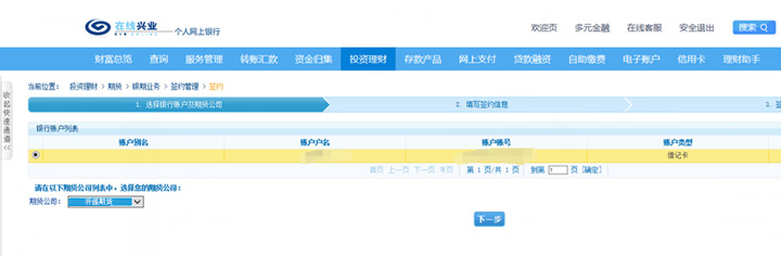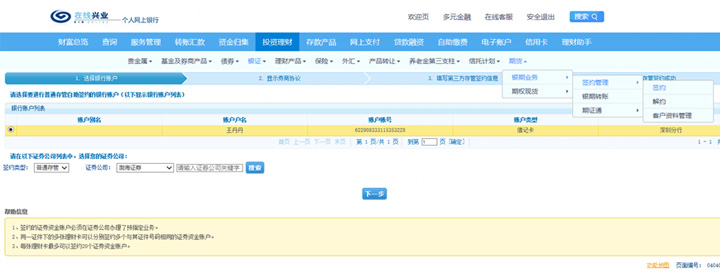 選擇“投資理財”-“銀證”-“期貨”-“銀期業(yè)務”-“簽約管理”-“簽約”。