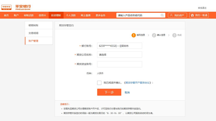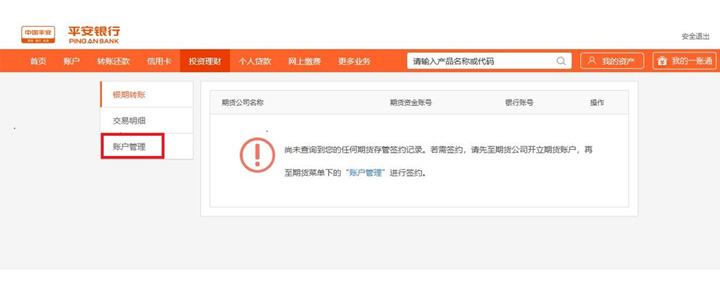 進(jìn)入銀期業(yè)務(wù)界面后,若尚未在期貨公司有關(guān)聯(lián)信息,會有相應(yīng)提示,您可選擇右側(cè)“賬戶管理“進(jìn)入簽約界面。