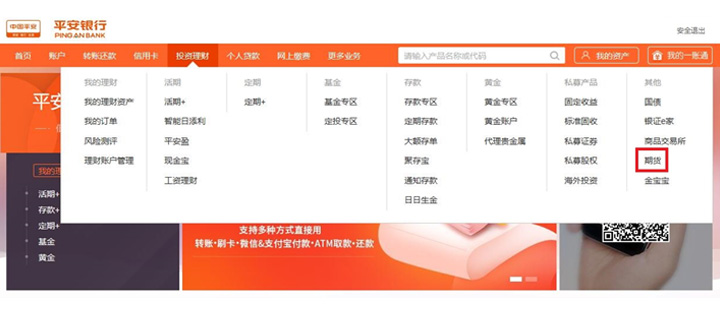 進(jìn)入網(wǎng)銀后,點擊“投資理財”-“其他“-”期貨“,而后便可進(jìn)入銀期業(yè)務(wù)界面。