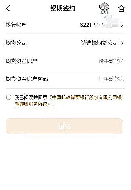 U存管-期貨-銀期簽約-選擇銀行賬戶,期貨公司“齊盛期貨”等信息,勾選我已閱讀并同意,點擊提交。
